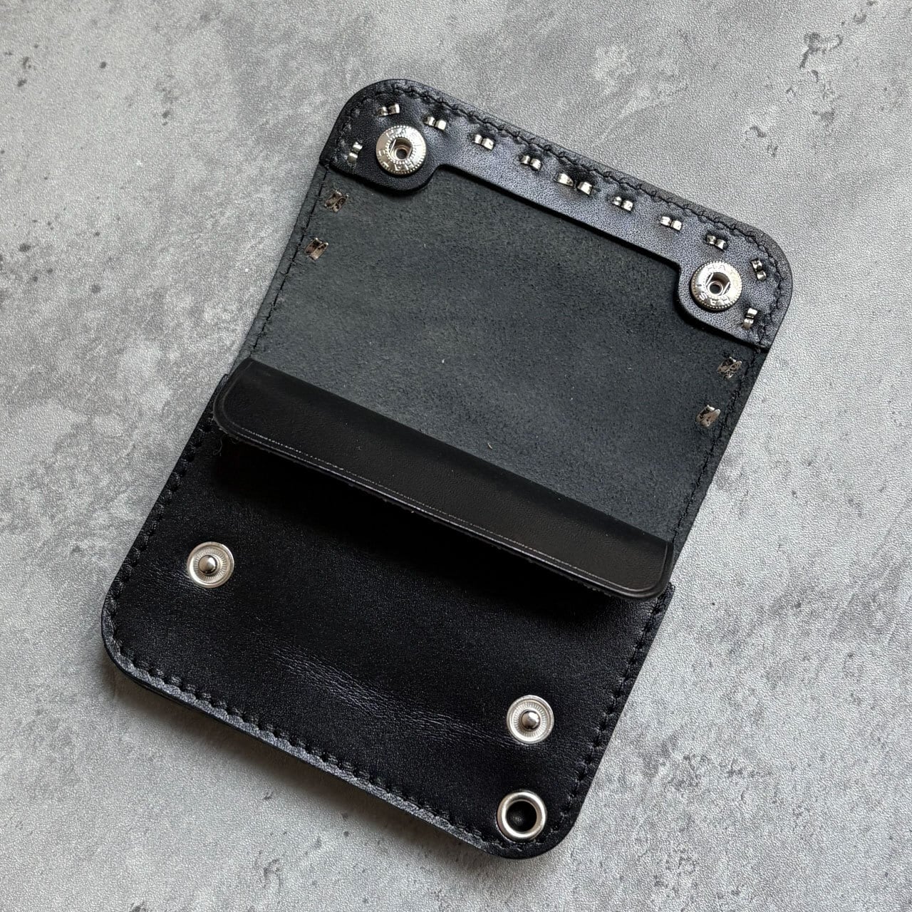 栃木レザーのジーンズを使用した、ショートトラッカーウォレットにアメリカ製の真鍮スタッズをカスタムしました。