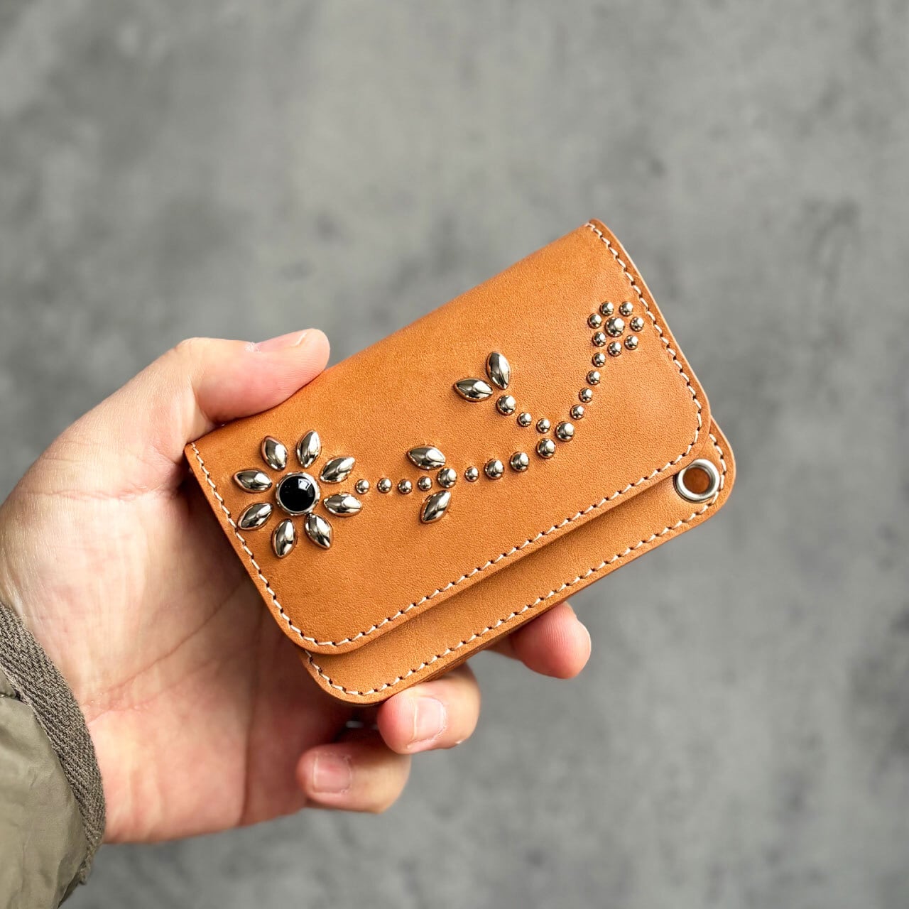 栃木レザーのジーンズを使用した、トラッカーウォレットにアメリカ製の真鍮スタッズでフラワーデザインにカスタムしました。