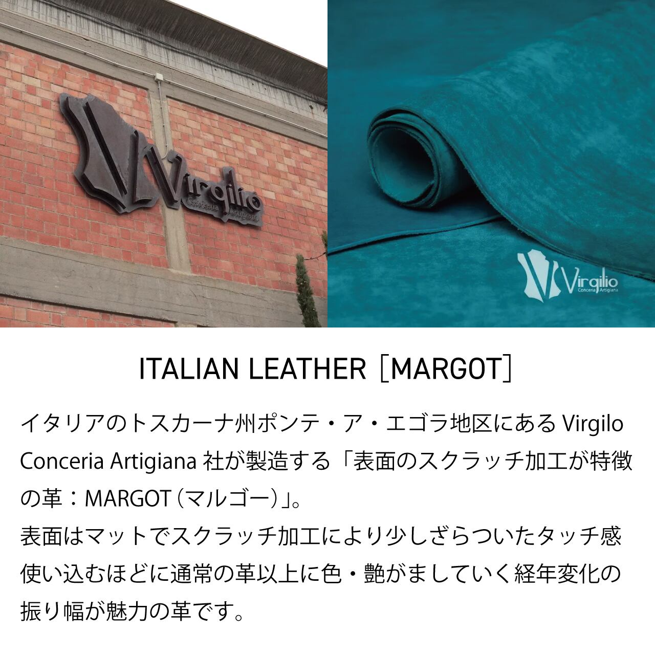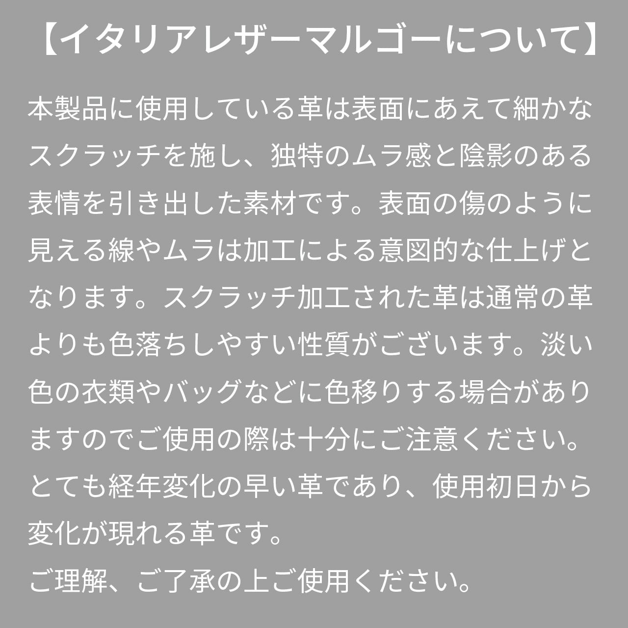 表革には、発色の良さと独特のマットな質感が特徴のイタリアレザー「MARGOT」を採用。革の表面にスクラッチ加工を施すことで、均一ではない自然なムラ感と奥行きのある表情を生み出しています。新品の状態から雰囲気があり、使い始めたその日からエイジングが始まるため、経年変化をしっかり楽しめる革です。使用を重ねることで色味に深みが増し、自分だけの一本へと育っていきます。