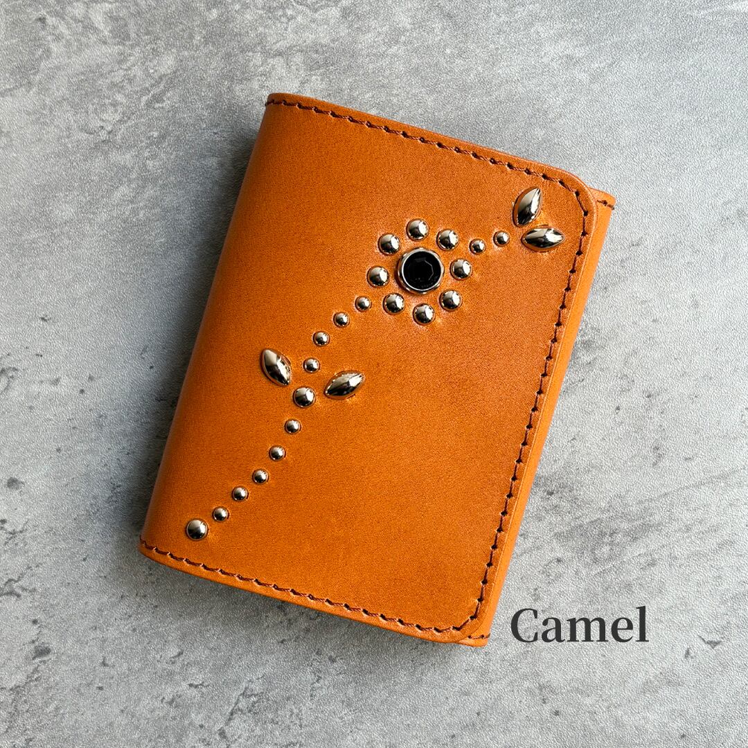 栃木レザー社のヌメ革を使用したコンパクト財布にアメリカ製のスタッズでフラワーデザインにカスタムしました。